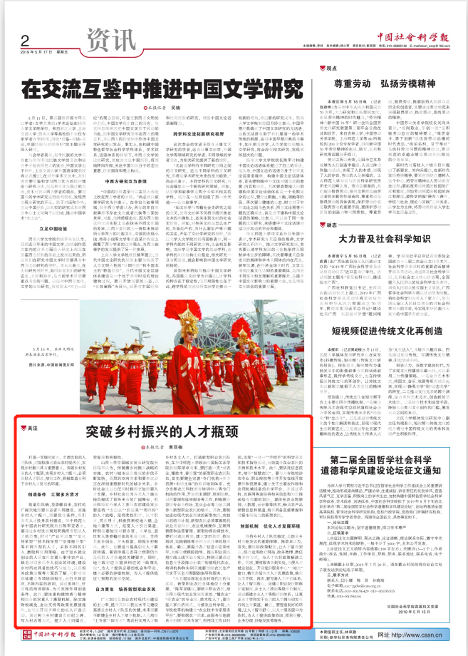 近日,基地主任陈荣卓教授围绕乡村人才振兴问题接受了《中国社会科学报》记者的专题采访。5月17日,《中国社会科学报》刊登了“突破乡村振兴的人才瓶颈”专题文章。