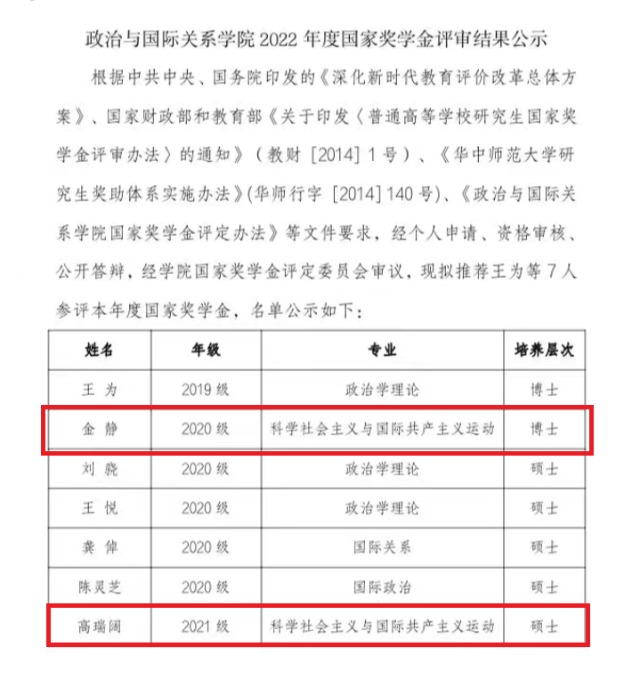 近日,我校开展2022年度研究生国家奖学金的评选工作。经个人申请、资格审核、公开答辩等程序,由学院国家奖学金评定委员会审议推荐、学校研究生奖学金评审领导小组审核,基地金静博士、高瑞阔硕士荣获2022年度研究生国家奖学金。