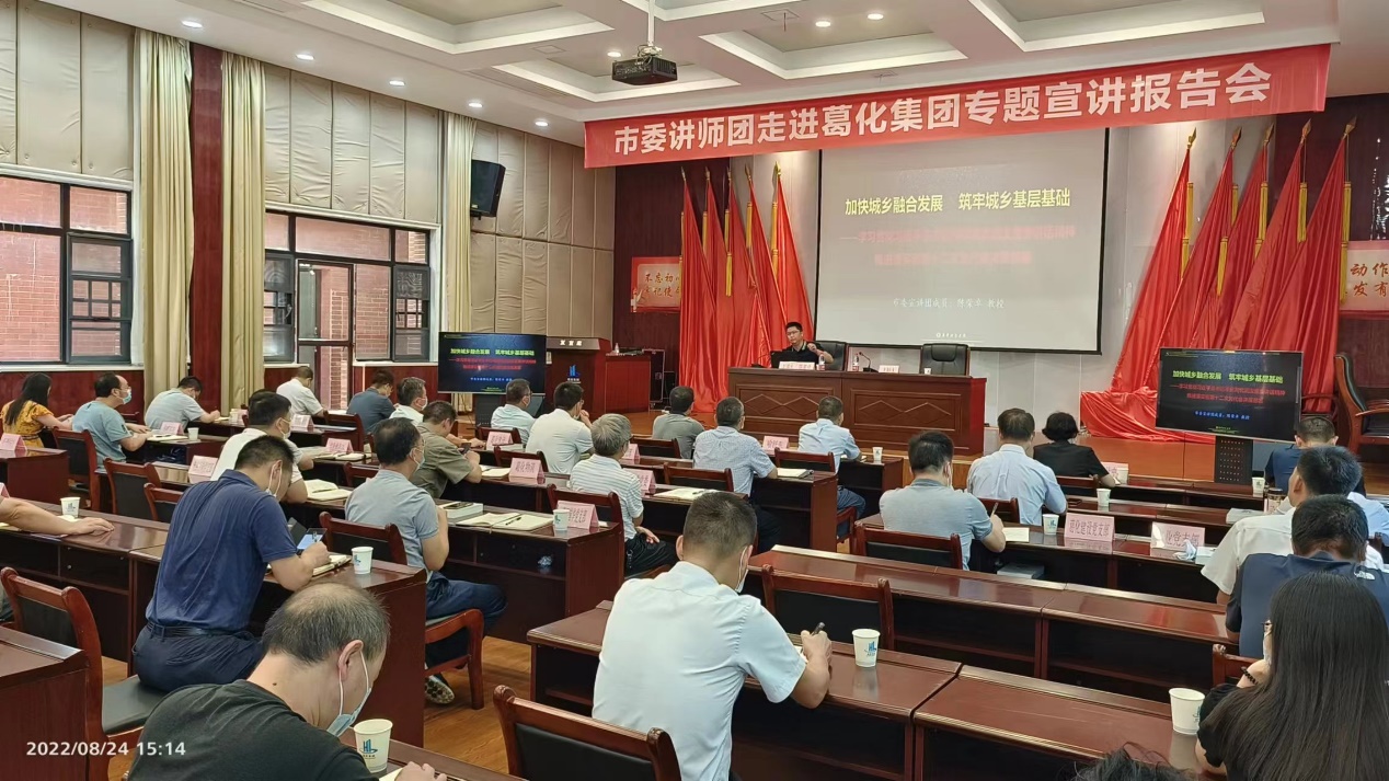 8月24日,市委宣讲团葛化集团宣讲报告会举行,陈荣卓教授作“加快城乡融合发展 筑牢城乡基层基础”专题宣讲报告。葛化集团领导班子成员,各部门、直属单位负责人,各基层党组织负责人、工会主席、团委书记及团委委员等50余人参加。陈荣卓教授从学习贯彻习近平总书记考察湖北武汉重要讲话精神出发,围绕推进落实省第十二次党代会决策部署,对如何认识城乡基层治理的当前形势、重要挑战、超越路径进行了深度解读,全面讲解城乡融合发展“五化”内涵与实质,系统阐述实现城乡融合发展的途径和办法。