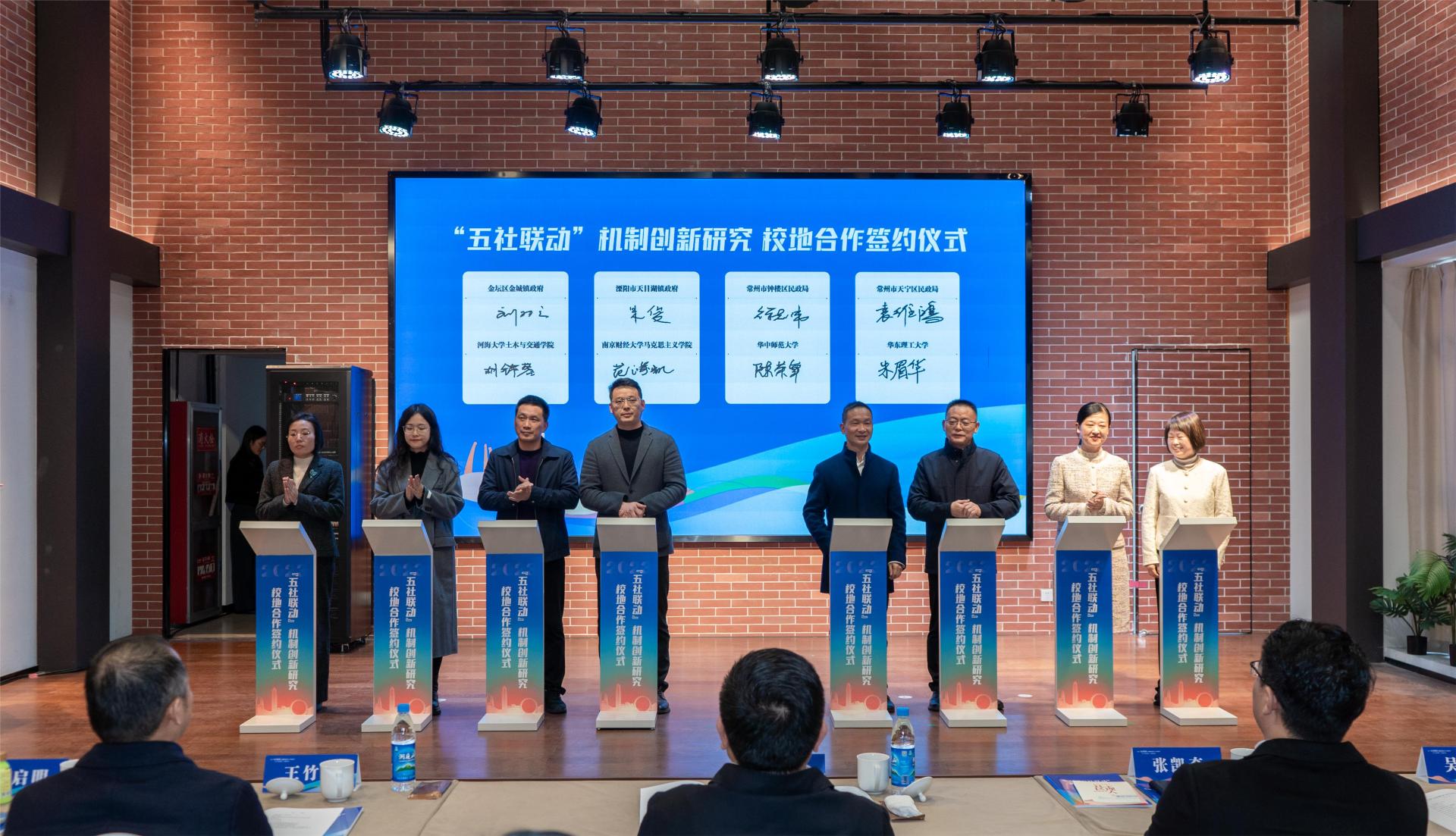 会上公布了江苏省“五社联动”试点单位名单,举行了“常州市社区营造学院”揭牌仪式,发布了《常州市天宁区“社区主理人”治理体系》。张凯奇区长在致辞中表示,天宁区通过党建引领、制度赋能、创新增效,高效促进“五社”力量跨域合作,积累了“社区主理人”等创新实践经验,探索形成了符合一方百姓生活需求的样板品牌和特色成果。随后,钟楼区民政局、金坛区金城镇、新北区三井街道负责同志分别作交流发言,在“五社联动”机制创新研究校地合作签约仪式环节,田新文教授代表华中师范大学全国民政政策理论研究基地与钟楼区民政局进行签约,为进一步夯实“五社联动”发展基础、完善“五社联动”支撑体系、丰富“五社联动”实践路径构建了多元化平台。