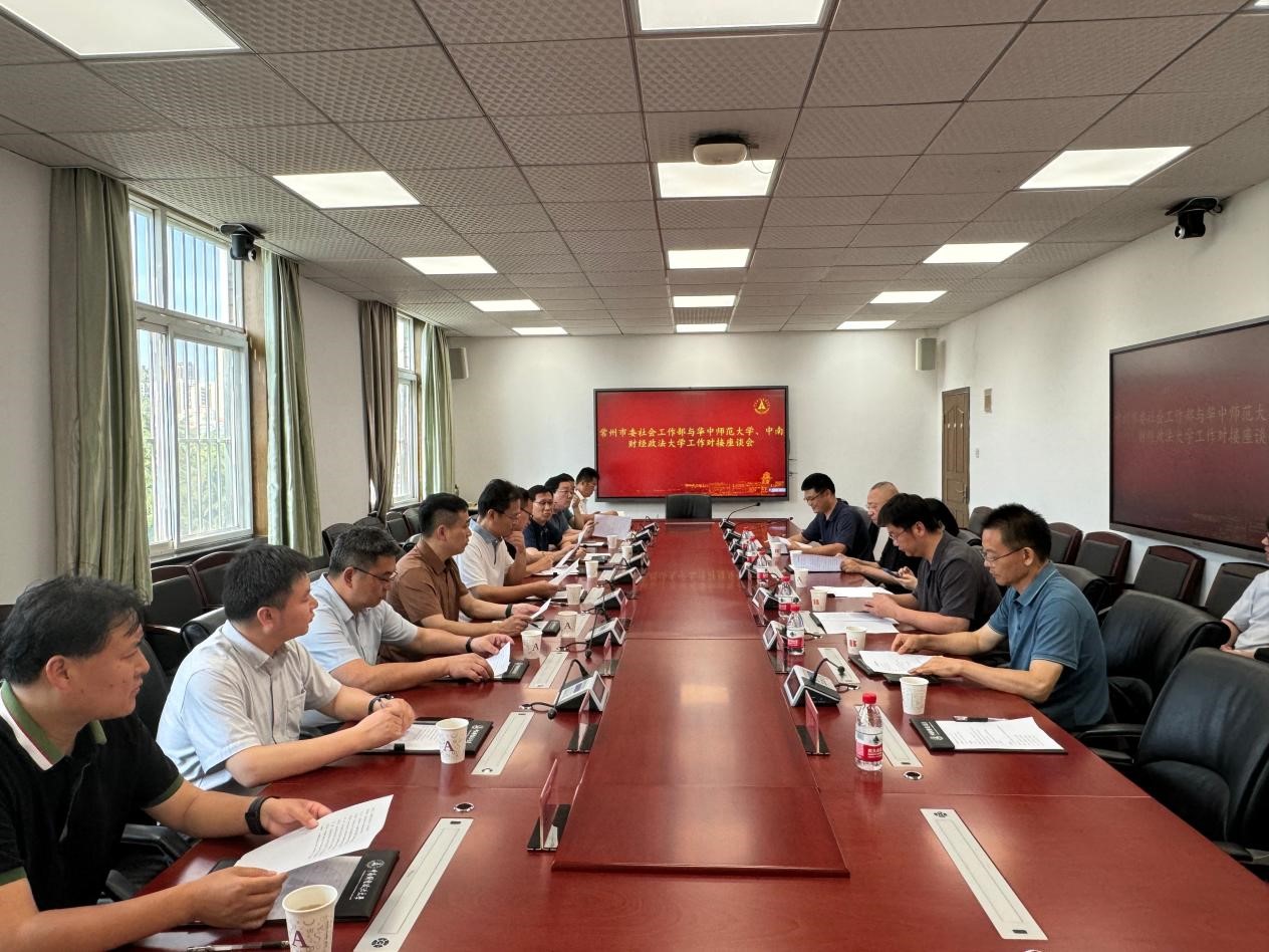 6月13日下午,常州市委社会工作部领导一行来汉交流座谈会在中南财经政法大学文沛楼顺利召开。常州市委社会工作部部长、市委非公有制企业和社会组织工作委员会书记尹涛、副部长孙启明、溧阳市委社会工作部部长黄晓军、金坛区委社会工作部部长徐俊、武进区委社会工作部部长朱军华、天宁区委社会工作部部长施军华、钟楼区委社会工作部部长闵志业、市财政局行政政法处处长周俊鹏、市委社会工作部基层政权和社区治理处处长王江华等同志到访,中南财经政法大学马克思主义学院党委书记邓杨、华中师范大学政治与国际关系学院唐鸣教授、陈荣卓教授、湖北科技学院马克思主义学院副院长田新文教授等参加座谈。会议由中南财经政法大学马克思主义学院副院长付佳迪主持。