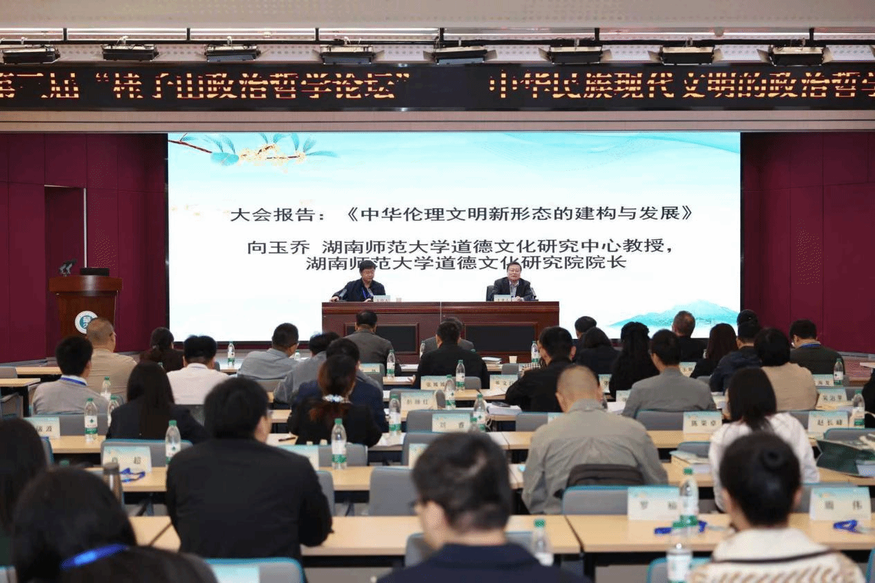 随后,陈荣卓教授主持大会报告。清华大学社会科学学院教授、教育部长江学者特聘教授任剑涛、湖南师范大学道德文化研究中心教授、湖南师范大学道德文化研究院院长向玉乔、上海大学马克思主义学院教授孙伟平等七位专家学者分别从中华伦理新形态、“地方性道德知识”、休谟的全球化伦理思想、文化自信、中国式现代化等多个视角紧扣本届论坛主题进行了学术分享。陈荣卓教授表示,与会专家学者以哲学理论为基石,以现代化文明建设为导向,不仅为我们深入理解中华民族现代文明所蕴含的政治哲学意蕴提供了多元视角和宝贵启示,而且为推动中华民族现代文明建设提供了坚实的哲理支撑。