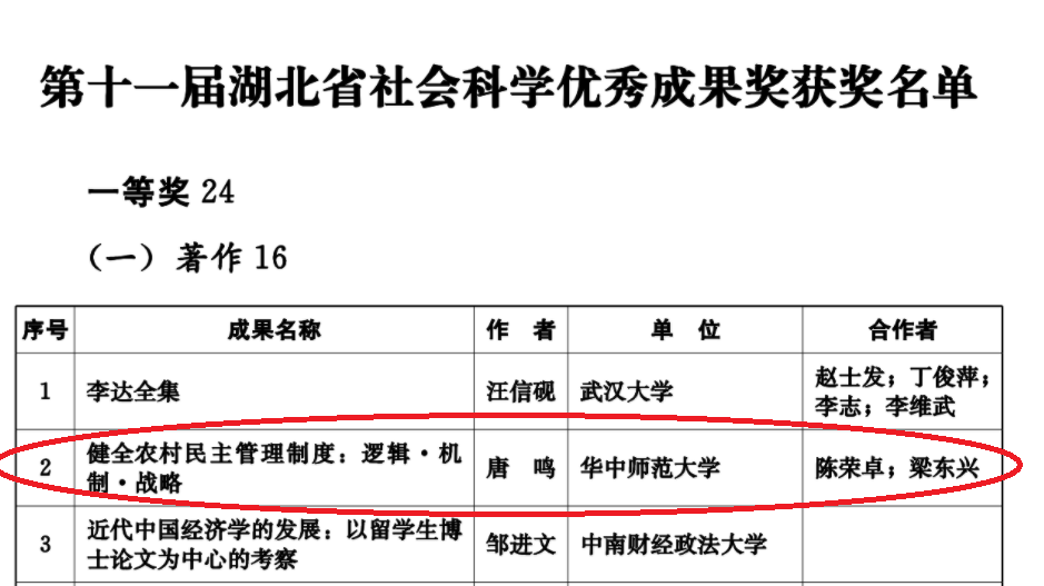 9月4日,湖北省人民政府颁发《第十一届湖北省社会科学优秀成果奖的通报》,唐鸣教授与陈荣卓教授合著的《健全农村民主管理制度:逻辑·机制·战略》一书荣获一等奖。