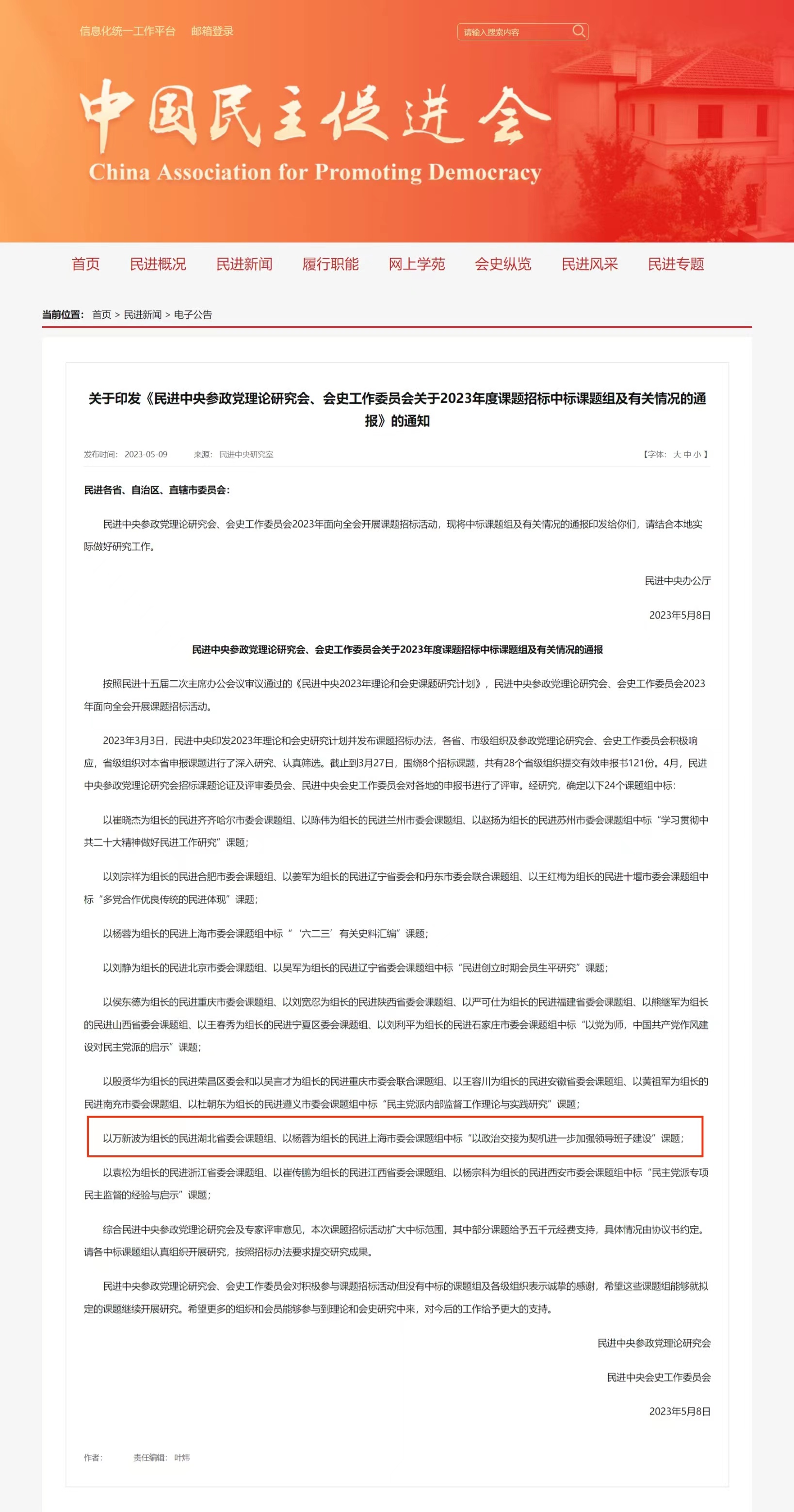 近日,民进中央发出《关于印发〈民进中央参政党理论研究会、会史工作委员会关于2023年度课题招标中标课题组及有关情况的通报〉的通知》,发布了民进中央2023年度课题招标评审结果,共有28个省级组织提交有效申报书121份。其中,以基地万新波博士为组长的民进湖北省委会课题组中标“以政治交接为契机进一步加强领导班子建设”课题。