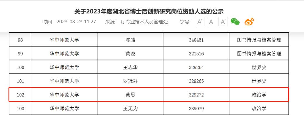 关于2023年度湖北省博士后创新研究岗位资助人选的公示--湖北省人力资源和社会保障厅 (hubei.gov.cn)