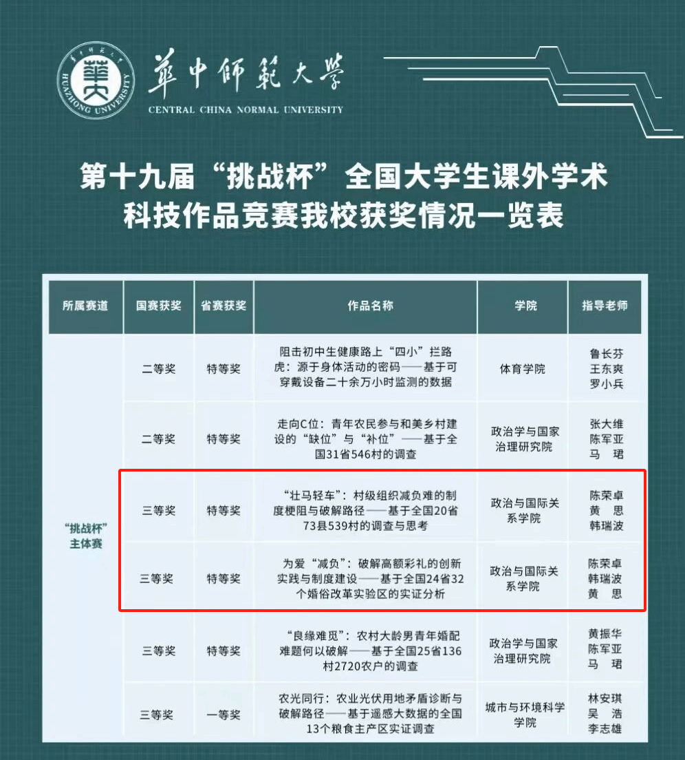 11月3日,第十九届“挑战杯”全国大学生课外学术科技作品竞赛全国终审决赛圆满收官。由陈荣卓教授、韩瑞波副教授、黄思老师共同指导的项目《“壮马轻车”:村级组织减负难的制度梗阻与破解路径——基于全国20省73县539村的调查与思考》《为爱“减负”:破解高额彩礼的创新实践与制度建设——基于全国24省32个婚俗改革实验区的实证分析》在本届“挑战杯”主体赛中荣获全国三等奖。项目聚焦“基层减负”“移风易俗”两大核心议题,以制度分析破解政策落地梗阻,用田野数据验证治理改革效能,在“调研—论证—反馈”的完整链条中实现了科创育人与服务社会的有机统一。