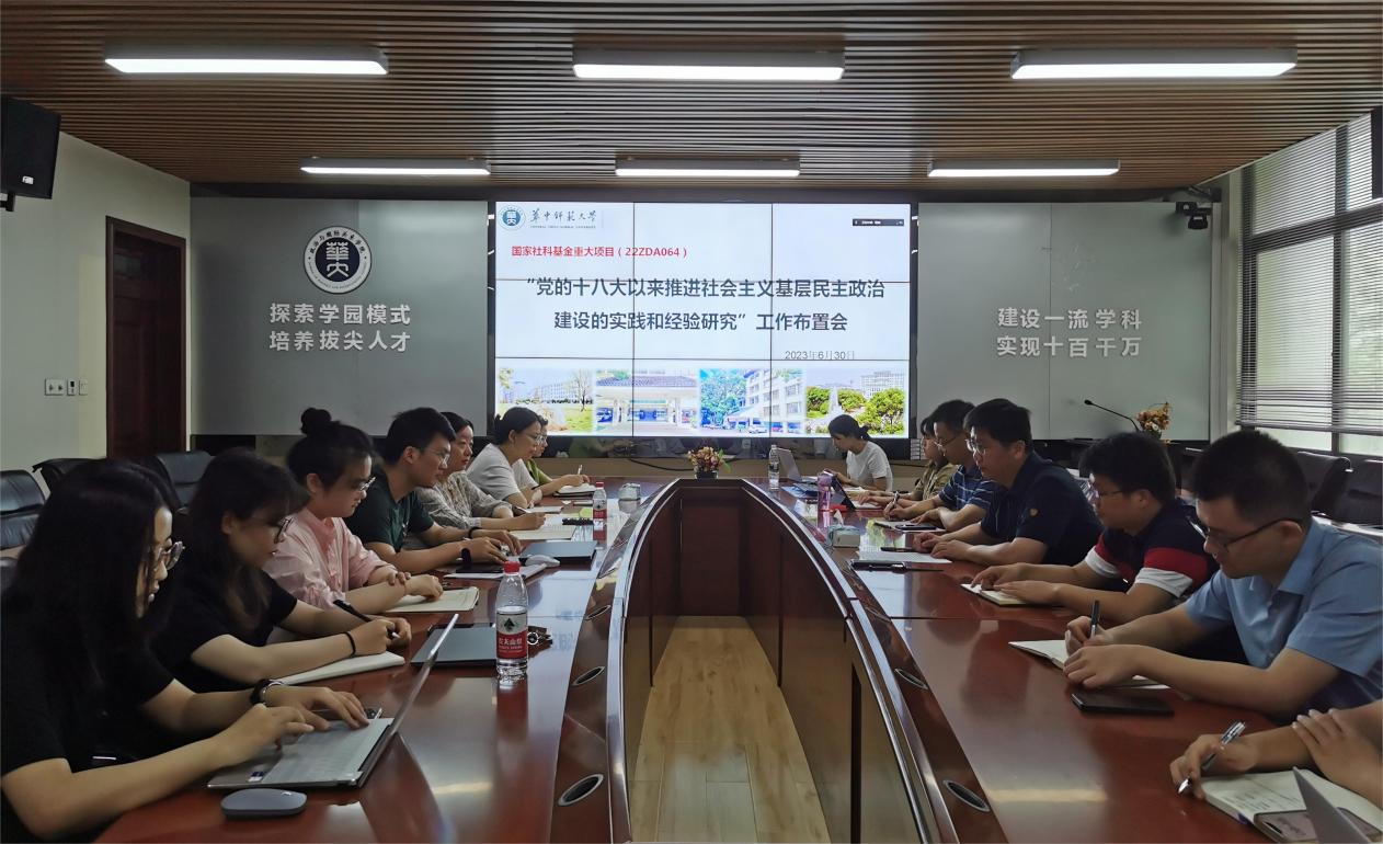 6月30日上午,陈荣卓教授在学院313会议室组织召开国家社科基金重大项目(22ZDA064)“党的十八大以来推进社会主义基层民主政治建设的实践和经验研究”工作布置会。基地田新文教授、王木森老师、陈鹏老师、韩瑞波老师、刘亚楠老师、郭松老师、黄思老师、李梦兰老师及部分博士参加。